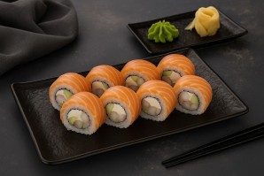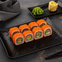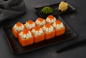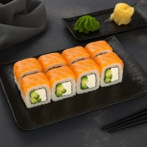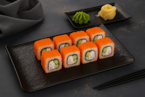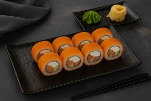 Рис, нори, икра тобико оранжевая, с/с лосось, огурец, сливочный сыр.