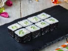 Состав: нори, рис, копченный лосось, огурец, оранжевая икра тобико.
