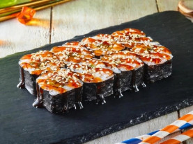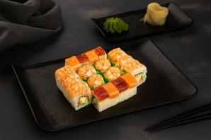 Рис, нори, икра тобико оранжевая, с/с лосось, королевская креветка, сливочный сыр, икра лососевая, огурец.