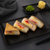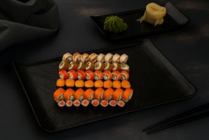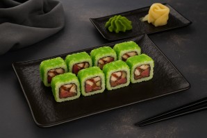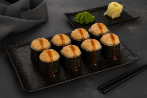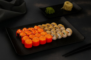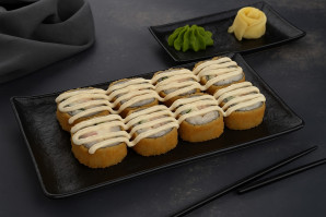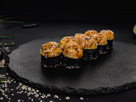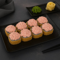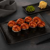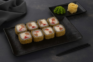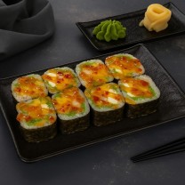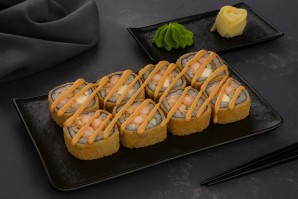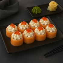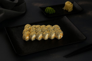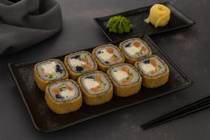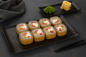 Нори, рис, копченный лосось, сливочный сыр, свежий огурец, черная или красная икра тобико, панировка