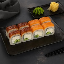 Рис, нори, свежий огурчик, сливочный сыр, с/с лосось, копченный угорь, яки соус, сыр, унаги соус.