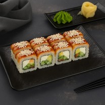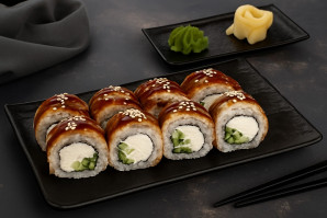 Рис, нори, сливочный сыр, лосось, копченый угорь, огурец, соус унаги, кунжут