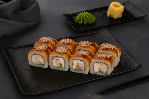 Рис, нори, мясо краба, королевские креветки, свежий огурец, копченный угорь, унаги соус