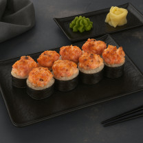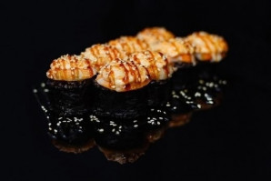 Рис, нори, королевские креветки, мясо краба, сливочный сыр. Шапочка: лосось, острый соус спайси, сыр пармезан, унаги соус, кунжут.