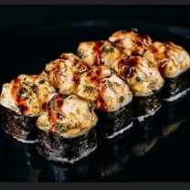 Состав: с/с лосось, мясо краба , сливочный сыр. Шапочка : королевские креветки, соус яки , сыр пармезан, унаги соус.