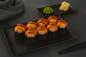 Рис, нори, мясо краба, свежий огурец, сливочный сыр Шапочка: королевские креветки, спайси соус, красная тобико