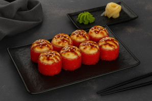 Рис, нори, лосось, сливочный сыр, огурец, яки соус, красная икра тобико, сыр пармезан, унаги соус, кунжут