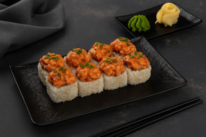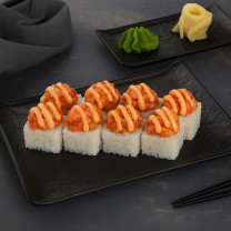 Рис, нори, сливочный сыр, свежий огурец, лосось, красная икра тобико, спайси соус