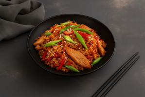 Состав: обжаренный рис, овощи, куриная грудка, устричный соус, соевый соус.