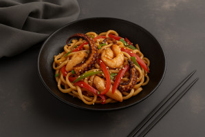 Лапша удон, креветки, осьминог, мидии, кальмар, перец, морковь, кунжут, соевый соус, устричный соус
