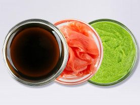 Рис, нори, сливочный сыр, огурец Шапочка: лосось, спайси соус, красная тобико