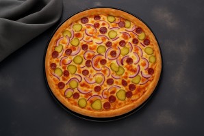 Томатный соус, колбаски салями, огурчики маринованные, перец болгарский, бекон, лук красный,