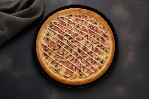 Томатный соус, окорок, карбонад, ветчина,маринованные шампиньоны, салями , помидоры, сыр моцарелла.