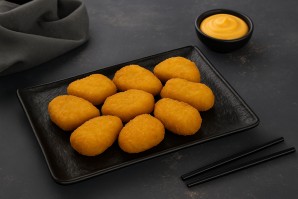 Состав: рис, нори, креветки в кляре, сливочный сыр, зелёная масаго, манго. Полит соусом Сладкий Чили.