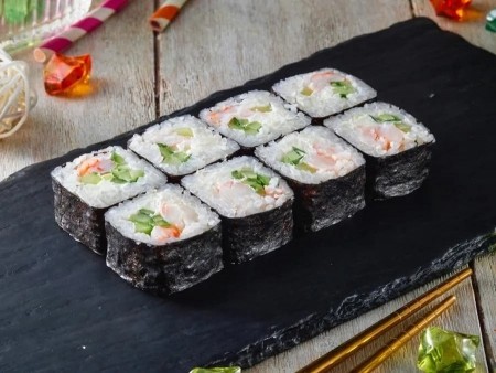 Состав: рис, нори, сливочный сыр, королевские креветки, огурец