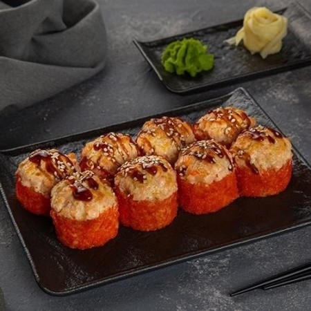 Состав: сливочный сыр, с/с лосось . Шапочка: мясо снежного краба премиум класса, сыр пармезан, красная масаго, яки соус, унаги соус