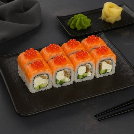 Рис, лосось, копченый угорь, сливочный сыр, огурец, икра лососевая.