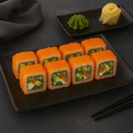 Рис, нори, икра тобико оранжевая, с/с лосось, огурец, сливочный сыр.