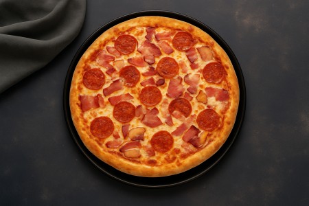 Томатный соус, окорок, карбонад, ветчина,маринованные шампиньоны, салями , помидоры, сыр моцарелла.