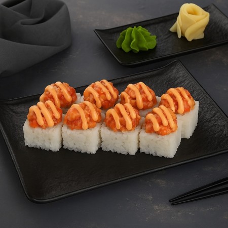 Рис, нори, сливочный сыр, огурец Шапочка: лосось, спайси соус, красная тобико