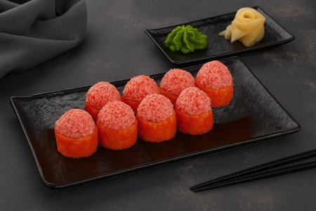Рис, нори, сливочный сыр, огурец, с/с лосось вокруг Шапочка: королевские креветки, фирменный соус, икра тобико,сыр пармезан.