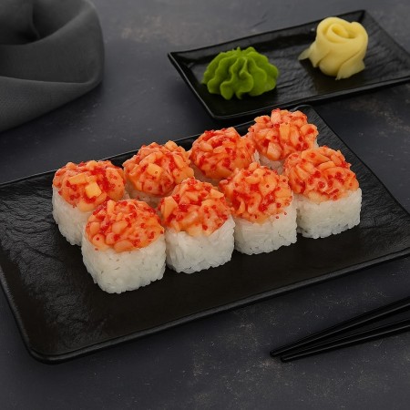 Рис, нори, мясо краба, свежий огурец, сливочный сыр Шапочка: королевские креветки, спайси соус, красная тобико