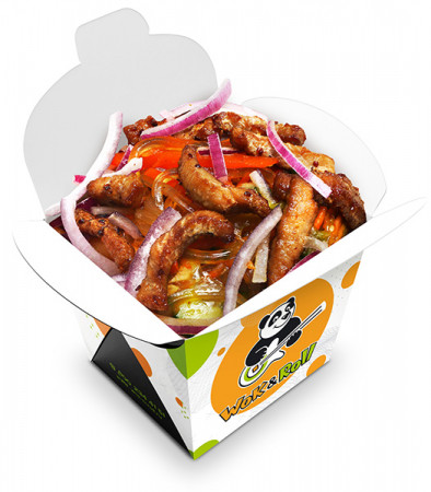 Стеклянная лапша, жареная курица в соусе унаги, морковь, капуста, перец болгарский, фасоль, брокколи, соевый соус, соус терияки, кунжут.