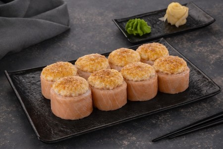 Состав: сливочный сыр, огурец, королевские креветки, полностью обёрнут лососем. Шапочка- яки соус, сыр пармезан.